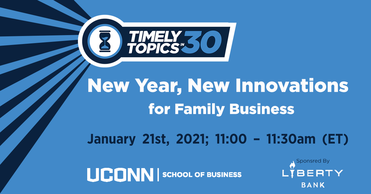 It’s a new year – what does innovation mean for your family business, and what resources are available to help? Next Thursday, January 21, join the UConn School of Business for 30 minutes and find out what your options are! Timely Topics, brought to you by Liberty Bank.