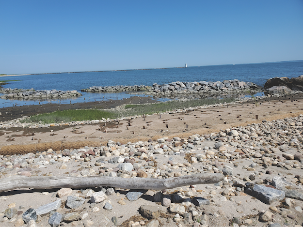 As a solution, an innovative hybrid living shoreline was proposed, designed and implemented at the site to decrease erosion of the beach/dune habitat, create marsh habitat along the shoreline, and aid in the protection of the dune system. Living shorelines are a green infrastructure technique to aid in shoreline stabilization using native marsh vegetation. Sometimes low sills (such as rock or oyster reefs) are incorporated into living shoreline designs, hence the term, “hybrid” living shoreline. The purpose of a sill is to break and slow wave energy. Sills are placed parallel to the shoreline with the length and height dependent on site requirements. When multiple sills are used, large enough spaces between sills is required to allow for movement of marine organisms.