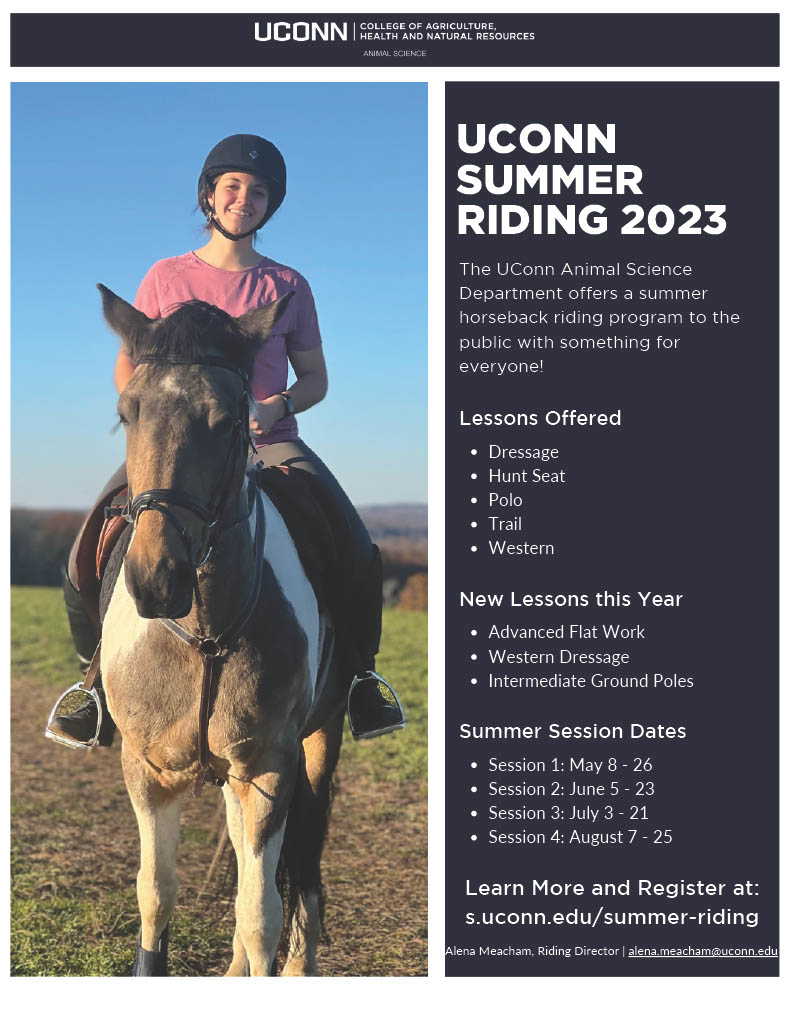 Are you looking for activities to get you outside this Summer? Do you want more riding instruction to grow your skillset? The UConn Animal Science department is offering horseback riding classes to the public this summer and there is something for everyone! Learn more at the following link: s.uconn.edu/summer-riding