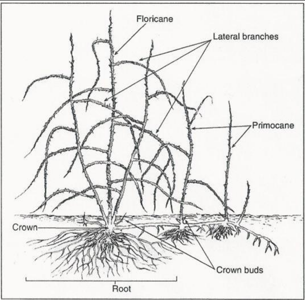 The growth habits of this group of plants vary in multiple ways, including how and where new canes develop on the plant.
