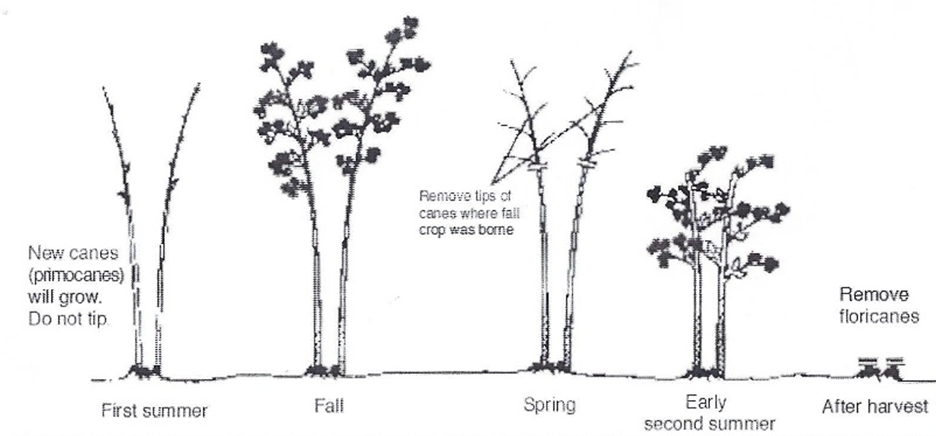 - Remove spent second-year fruiting canes (floricanes). Canes should be cut to the ground. Retain the primocanes that will provide their first main crop this fall.