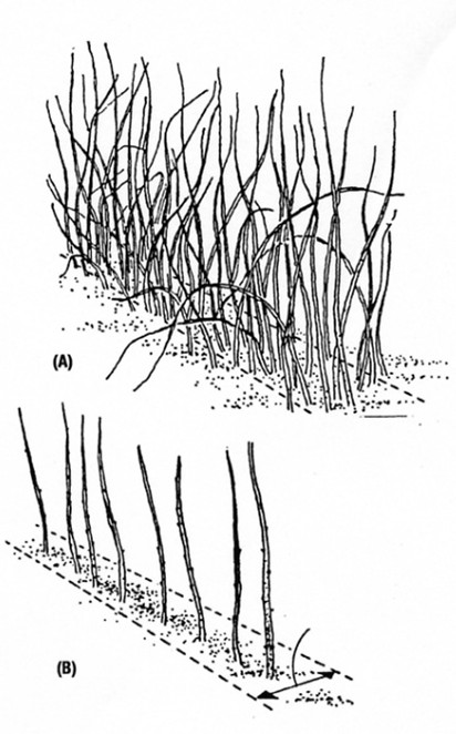 - Thin canes within the planting row to about four to five canes per linear foot of planting row (Figure 3). The planting may look sparse at this point. This is okay.