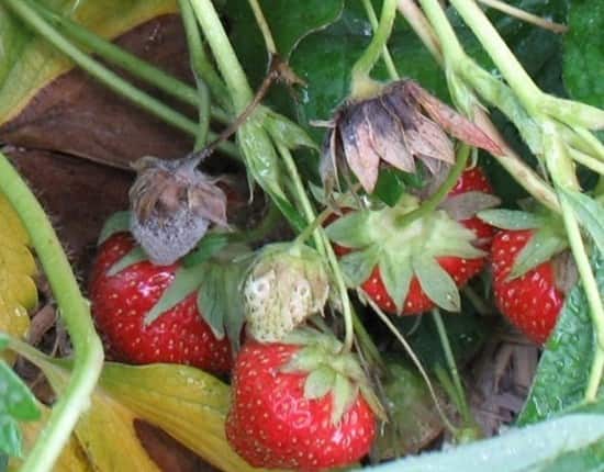 Botrytis Blossom Blight/Gray Mold (Botrytis cinerea) also known as gray mold, is a prolific fungal disease of strawberries and other fruit crops. This pathogen overwinters in soil debris. Spring wind and rain release its spores are released and spread. Young tissues, including developing leaves and blossoms, are highly susceptible to infection. During this time, the biggest concern is infection of the king blossoms. King blossoms give the biggest fruit; without them, crops can be severely impacted.
